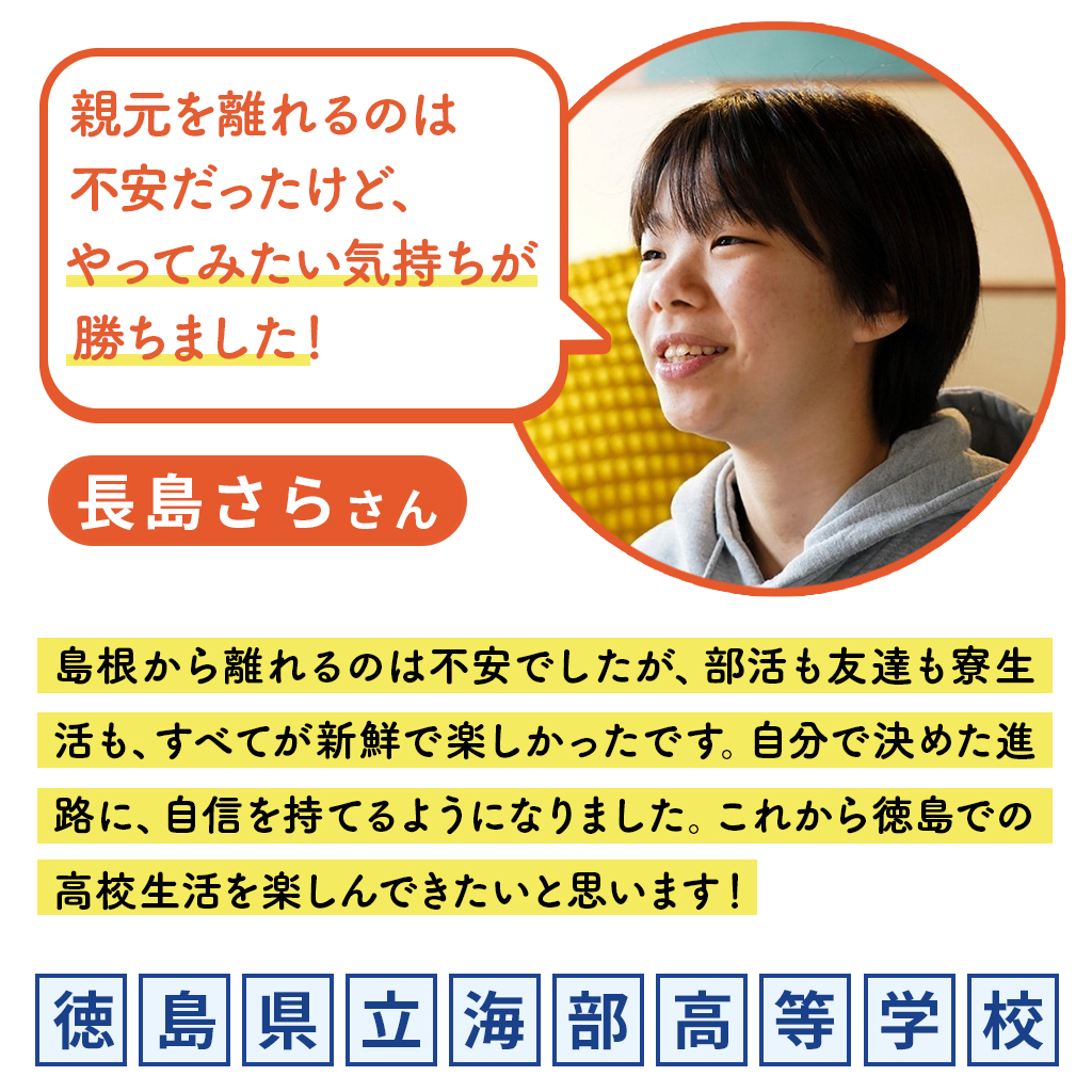 島根県から徳島県の海部高校に越境進学を決めた長島さん。中学ではバレー部に熱中し、学級委員にも挑戦。もともと地域みらい留学には関心がなかったものの、進路を本気で考えはじめた中学3年のとき、改めて調べる中で興味が高まっていきました。
