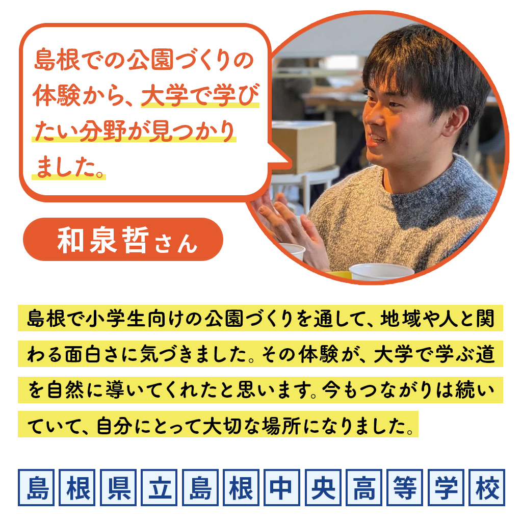 東京から島根中央高校に留学した和泉さんは、「自分を変えたい」という想いから寮生活を選びました。地域での暮らしや出会いの中で、コミュニティに関心を持ち、高校2年で参加した“公園をつくるプロジェクト”が進路を考える大きなきっかけに。その経験をもとに、東京都立大学の人文社会学部に進学しました。