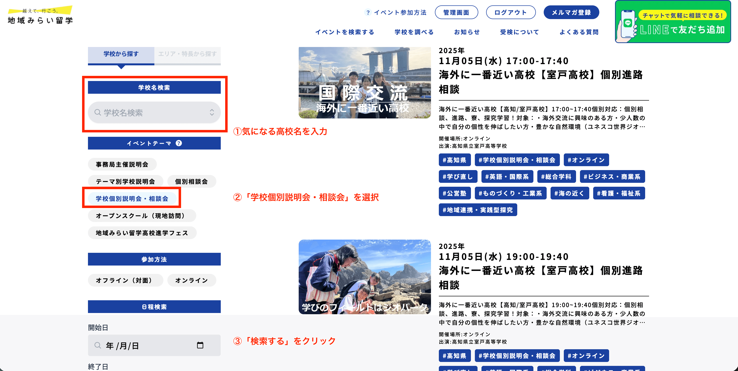 イベントページから「学校個別説明会・相談会」で検索し、希望校の「個別説明会・相談会」の日程を確認しましょう。