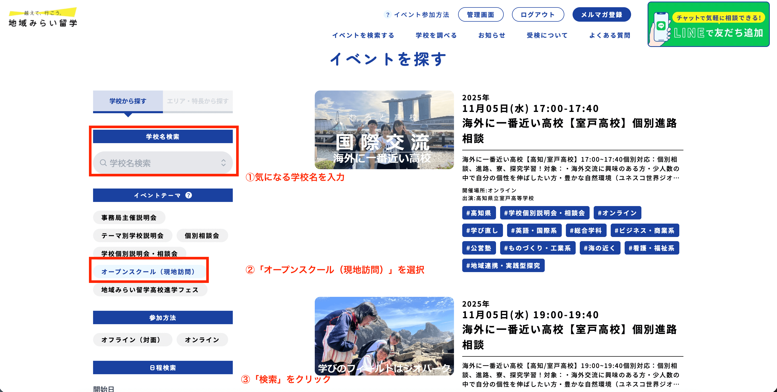 オープンスクールは、イベントページから「オープンスクール(現地訪問)」で検索し、希望校の開催日程を確認しましょう。