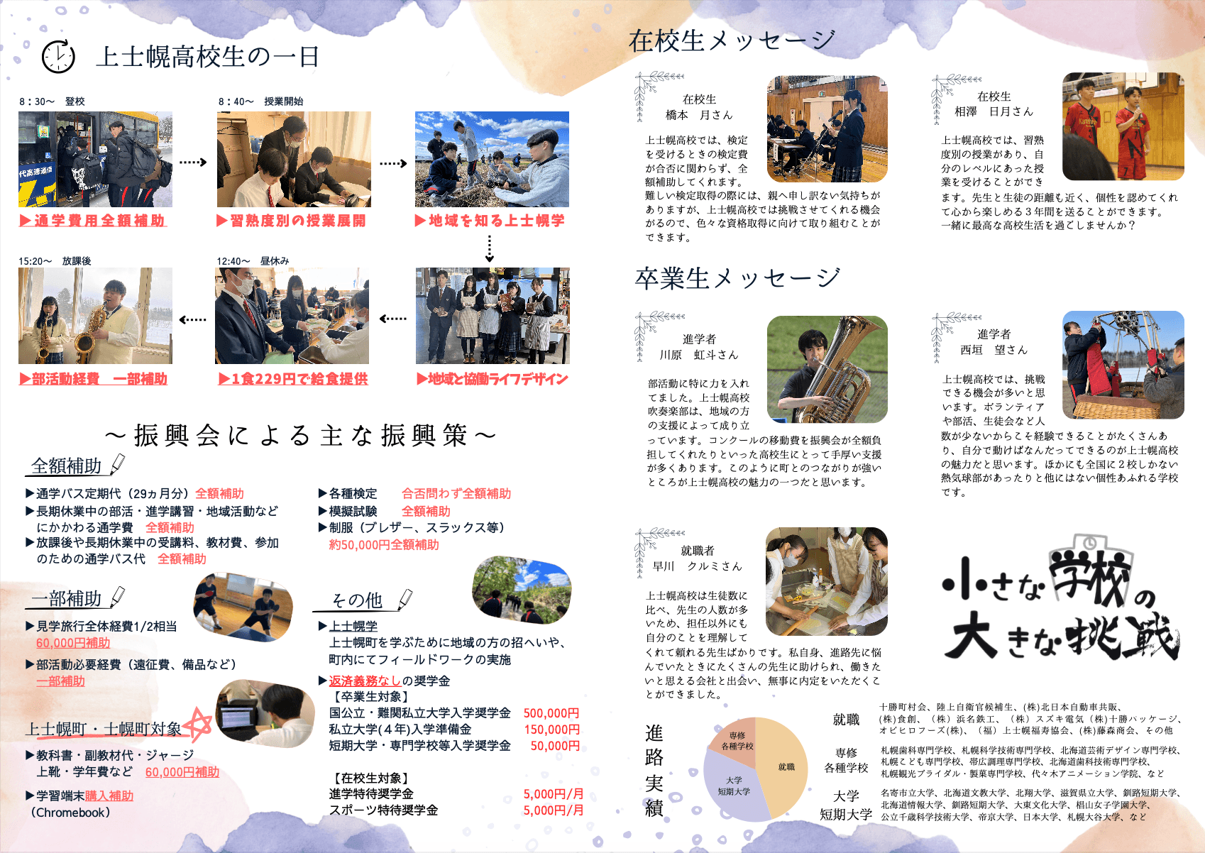 制服代は上士幌高校振興会より全額補助を行っています。 また、上士幌町に住民票を移すことで、教科書代・ジャージ代・学習用端末代の購入補助を受けることができます。